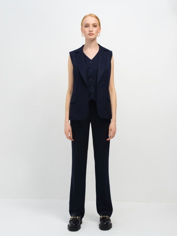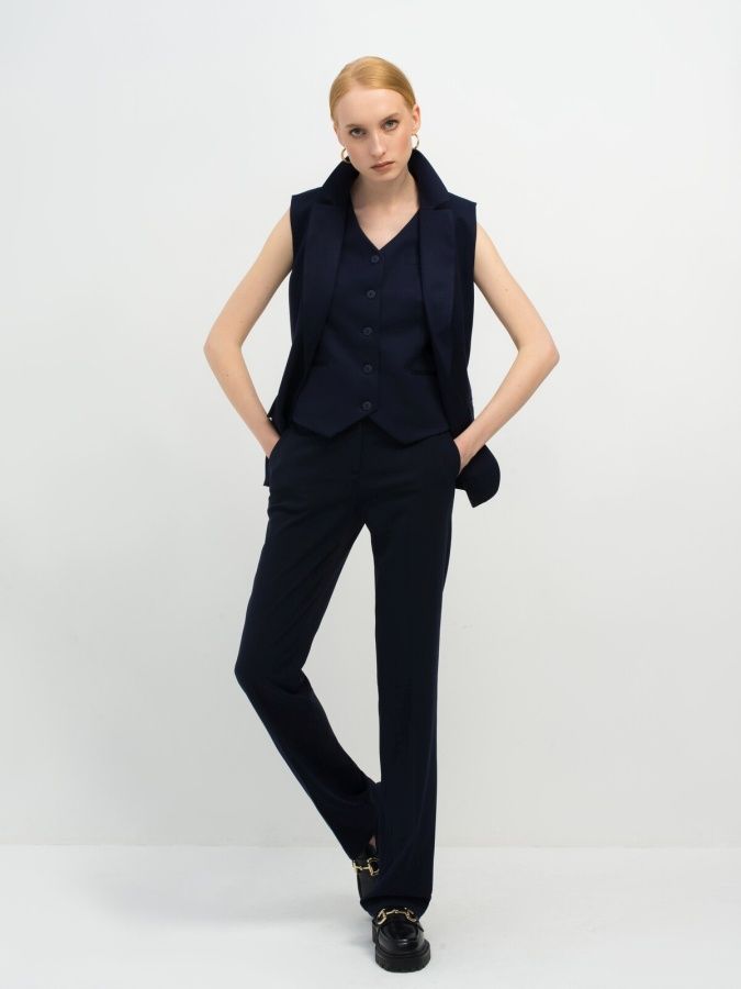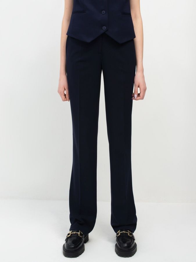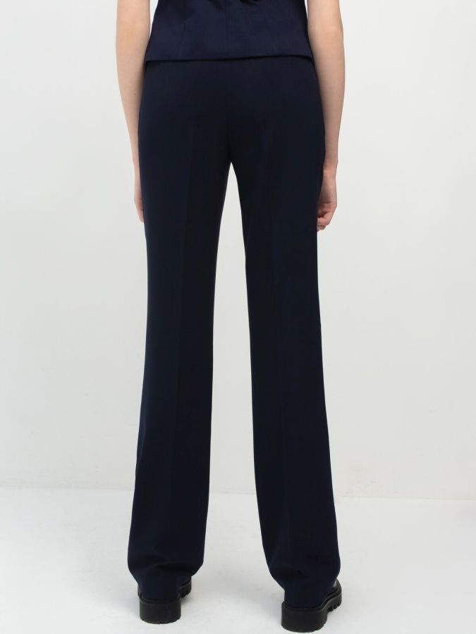 Детали | Средняя посадка. На передних половинках карманы с отрезным бочком. Застежка- гульфик на молнию и крючок. Пояс шириной 3.5 см.