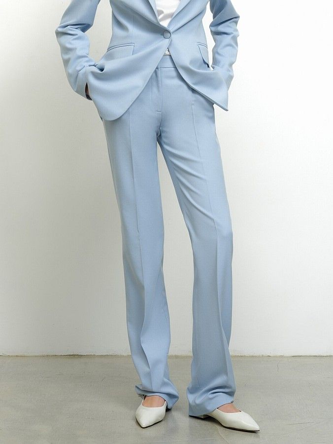 Детали | Средняя посадка. На передних половинках карманы с отрезным бочком. Застежка- гульфик на молнию и крючок с пуговицей внутри. Пояс шириной 3.5 см.