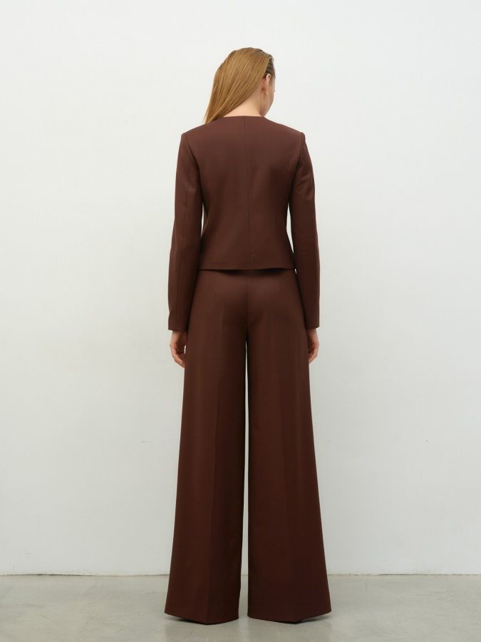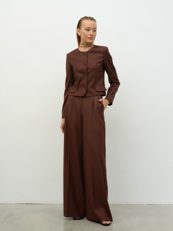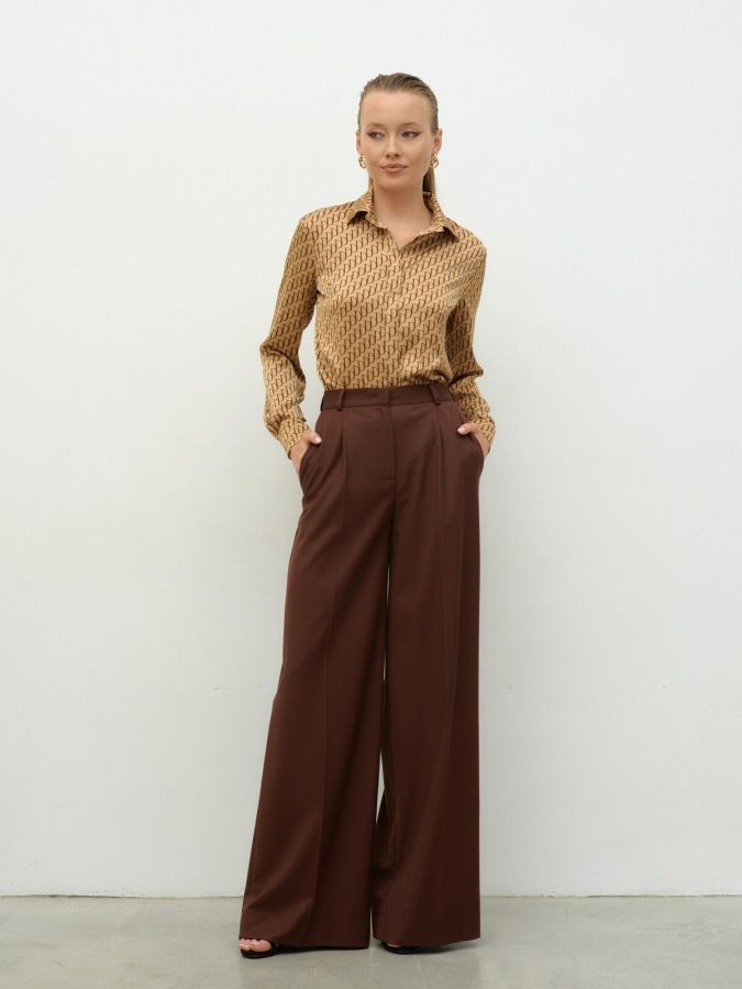 Детали | Средняя посадка. На передних половинках карманы с отрезным бочком и складкой. Застежка-гульфик на молнию. Пояс шириной 4 см.