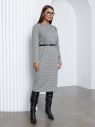 Платье из кроеного трикотажа. Фигурная асимметричная линия горловины. Сборка на плече. Полуприлегающий силуэт. Втачные рукава. На талии ремень из экокожи. Застёжка на потайную молнию в среднем шве спинки. Длина миди.