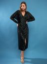 Платье из нарядной ткани с пайетками. Силуэт прямой, рукава кимоно. Вырез V-образный. Спереди разрез. На талии съёмный пояс из атласа. Длина модели миди.