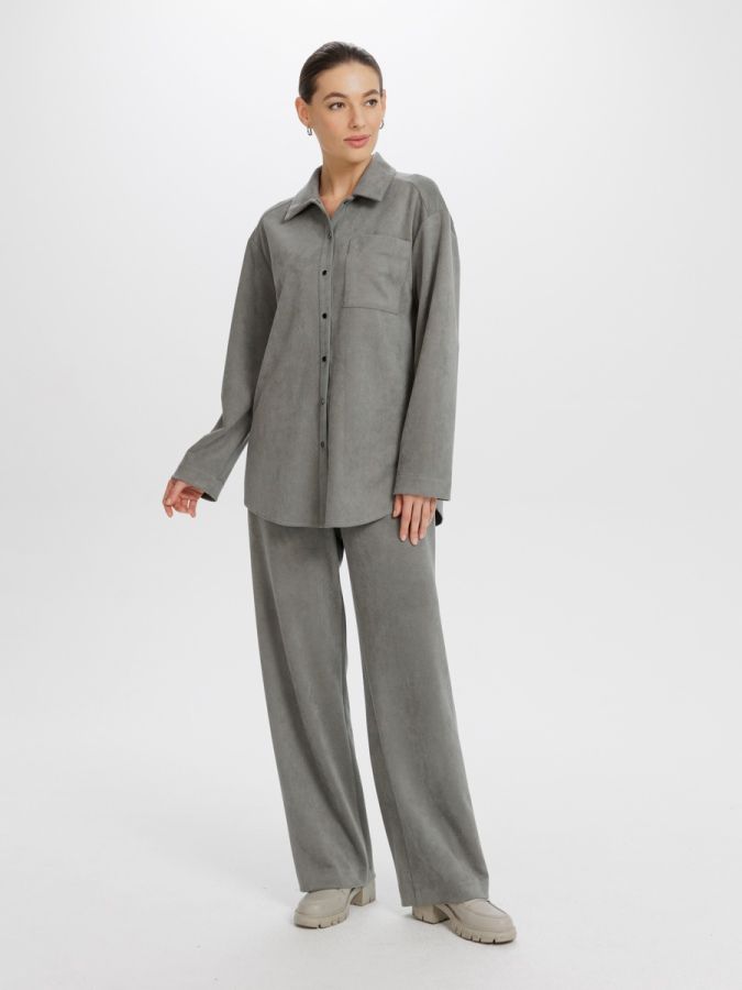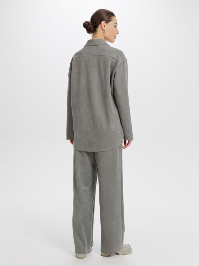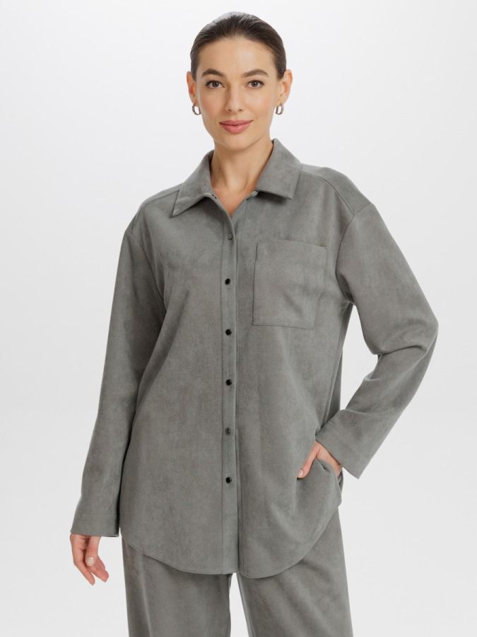 Рубашка-жакет из мягкой замши на трикотажной основе. Прямой свободный силуэт. Спущенное плечо. Отложной рубашечный воротник. Рукава полной длины. Застёжка спереди на кнопки. Накладной карман. Модель составляет комплект с брюками 4.5.1-119.1.
