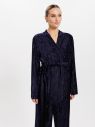 Удлиненный жакет из мягкого, фактурного бархата с эффектом гофре в благородном фиолетовом тоне -прекрасное решение для роскошного новогоднего торжества и комфортного вечера в семейном кругу. Нежный уют и безупречная выразительность гарантированы. Пояс, декорированный контрастной бахромой черного тона, идеально завершает образ, подчеркивая талию.