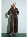 Элегантный комбинезон в стиле smart casuaI выполнен из сатинового полотна с оригинальным анималистичным дизайнерским принтом. Модель с лифом на навесные петельки и обтяжные пуговицы, на отрезном поясе, с эластичной лентой по спинке; воротник пиджачного типа. Рукава прямые, длины 7/8. Брюки длинные, расширенные, с косыми боковыми карманами и застежкой на тесьму "молнию" по переду. Комбинезон комплектуется съемным поясом из основной ткани. Длина брюк 110см.; длина рукава 47см.