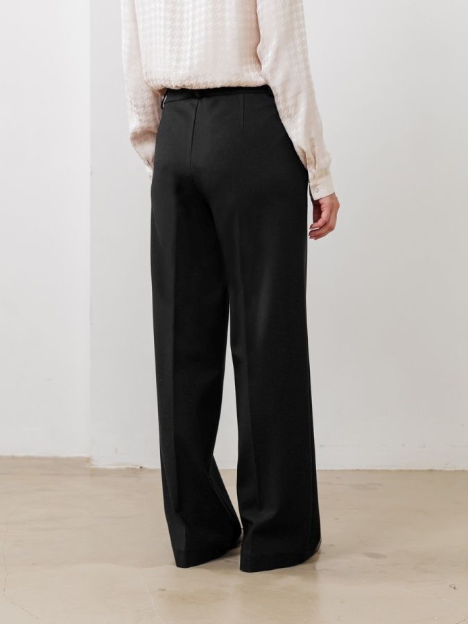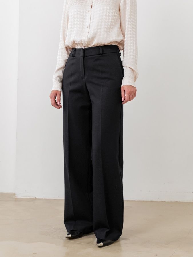 Угольно- черные классические брюки без декора, выполненные из тактильно приятной костюмной ткани необходимая часть базового гардероба. Комфортная средняя посадка, прямой силуэт, функциональные карманы.