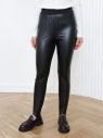 Легинсы. Спереди эластичная эко-кожа. Задняя половинка-матовый трикотаж. На задней половинке накладные карманы из трикотажа. На поясе широкая резинка.