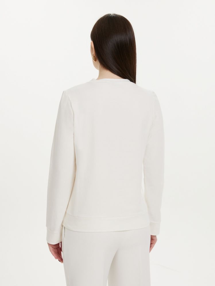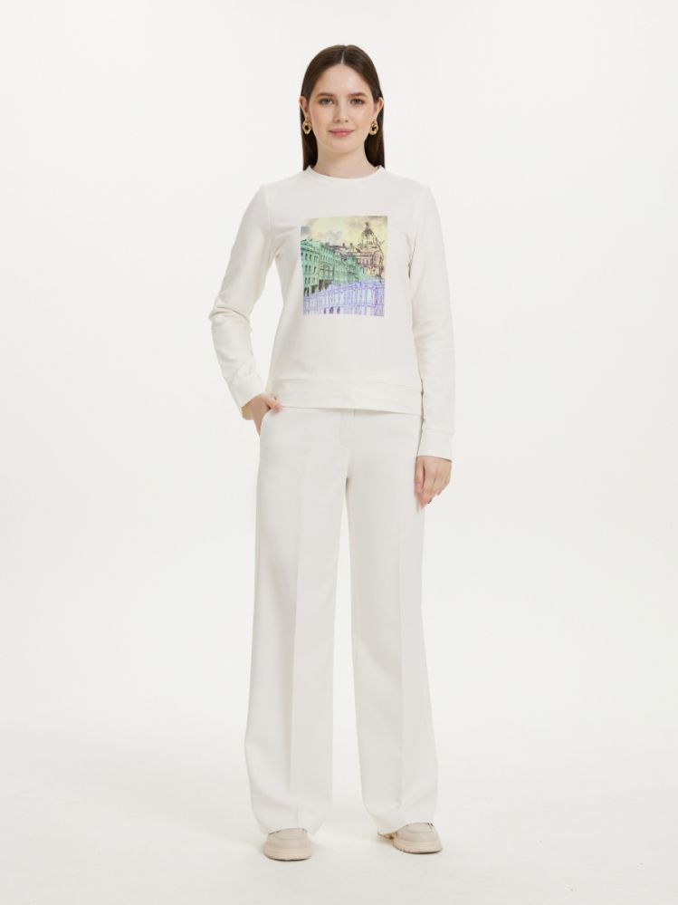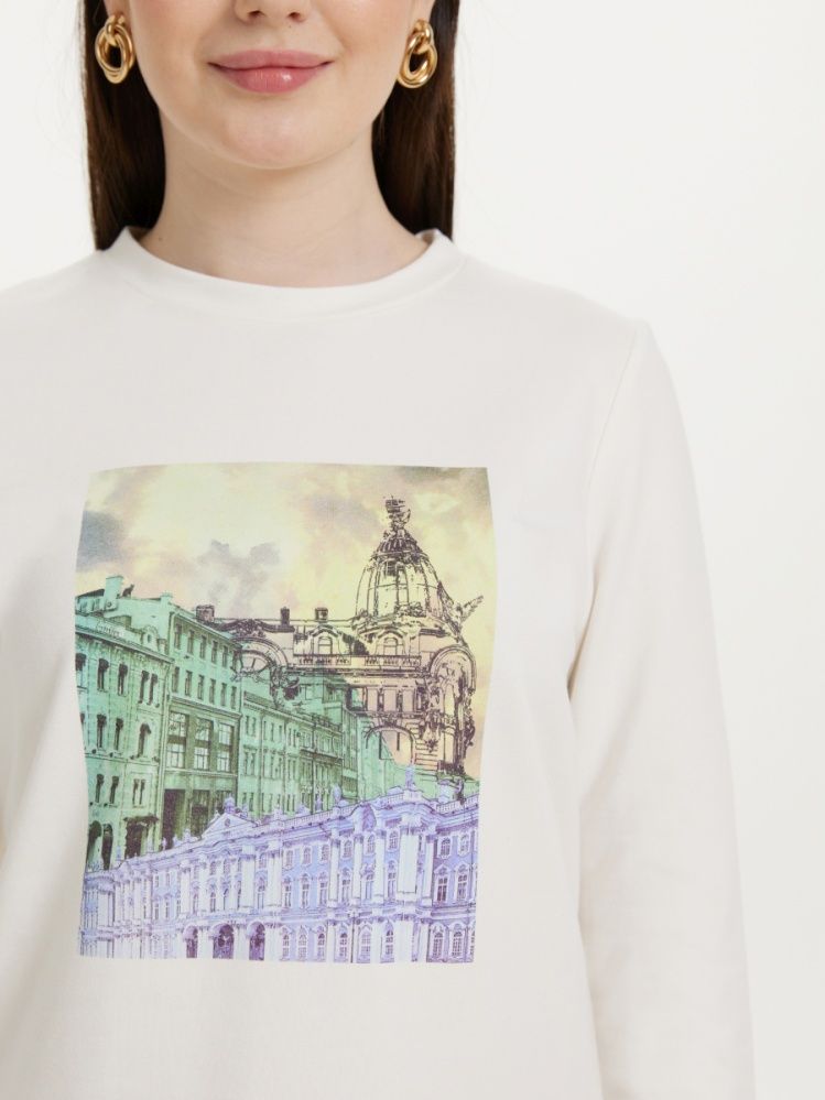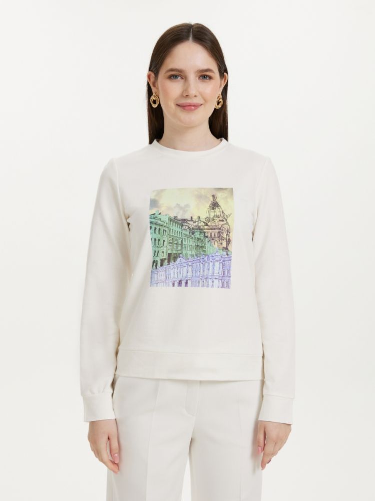 Элегантный свитшот, выполненный из комфортного трикотажа белого цвета . Модель декорирована уникальным принтом "Улицы Санкт-Петербурга", разработанным в нашей лаборатории. Это гарантирует индивидуальность вашему образу. Свитшот гармонично сочетается с брюками и юбками.