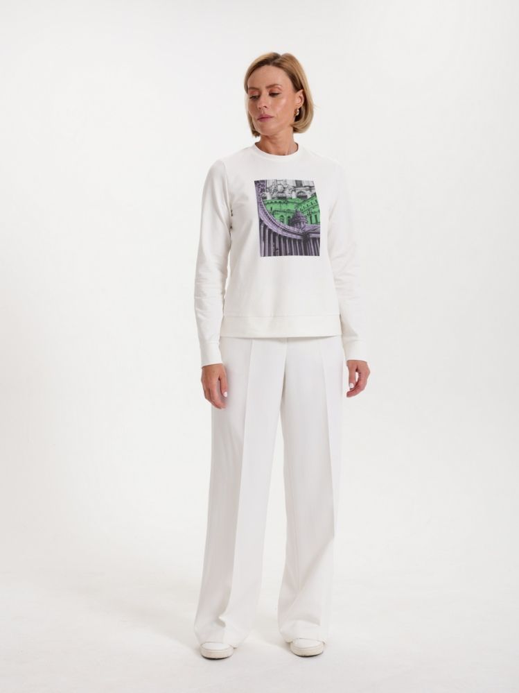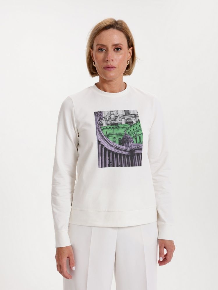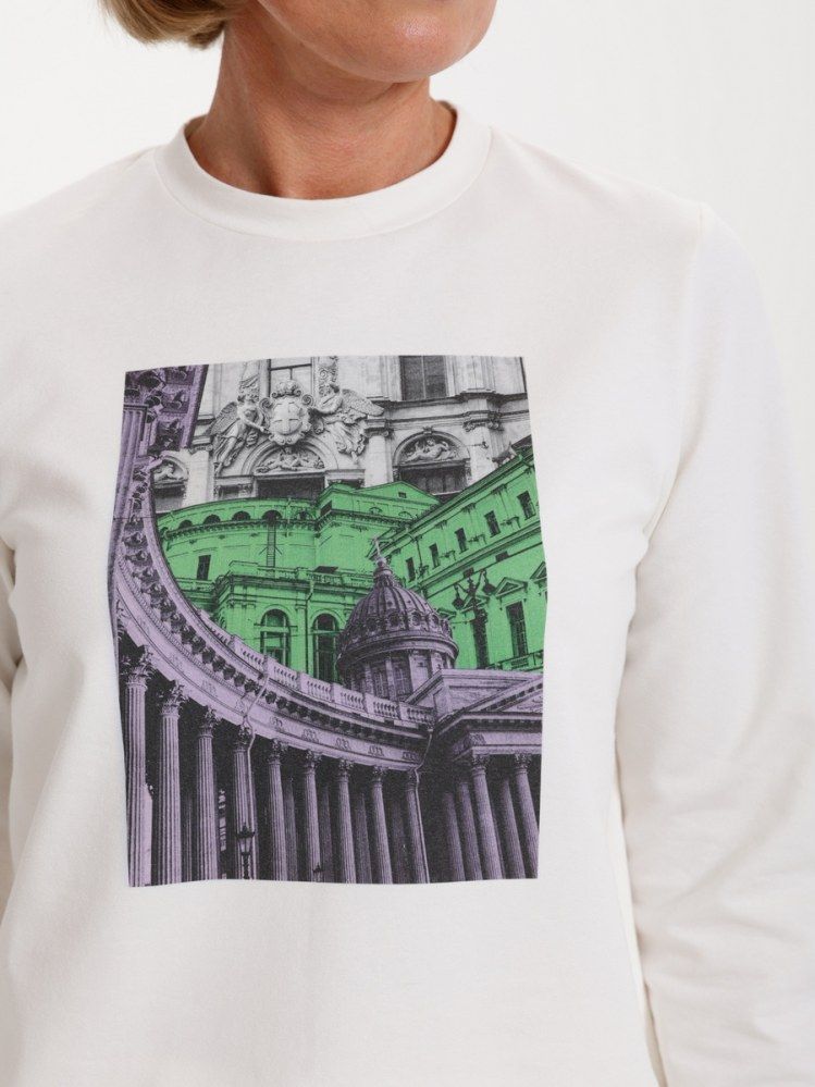 Элегантный свитшот, выполненный из комфортного трикотажа молочного цвета. Модель декорирована уникальным принтом "Улицы Санкт-Петербурга", разработанным в лаборатории нашего бренда. Авторская разработка гарантирует индивидуальность вашему образу. Свитшот гармонично сочетается с брюками и юбками.