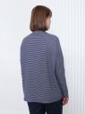 Джемпер из трикотажного полотна в узкую частую полоску. Спереди одна часть перевернута и полосы расположены вертикально. Спущенное плечо. Рукава полной длины, округлая горловина, разрезы по бокам. Спинка длиннее переда.