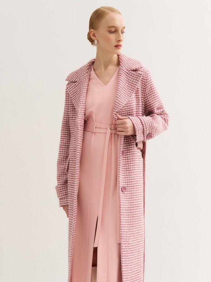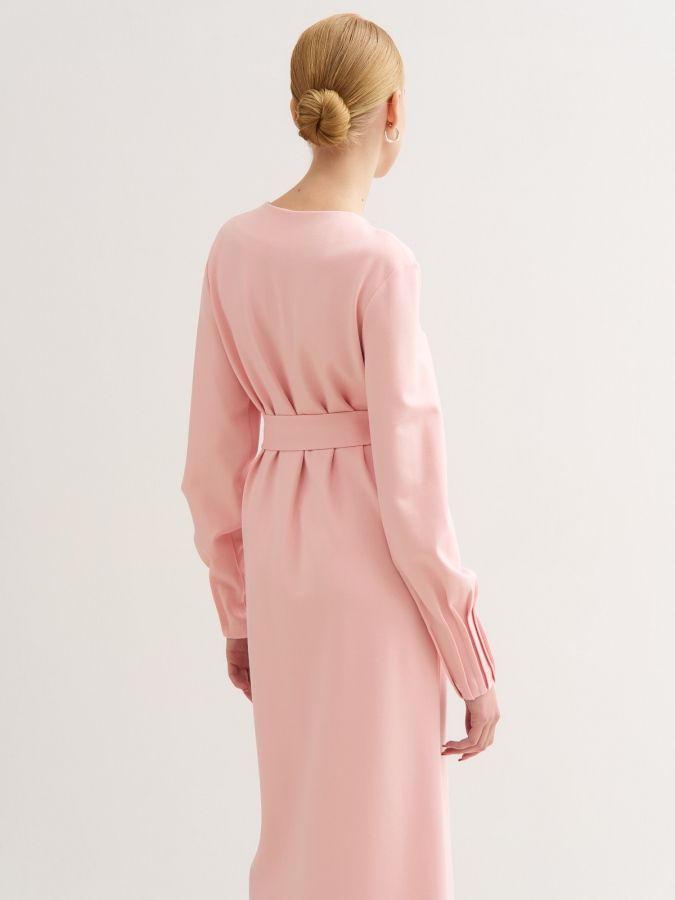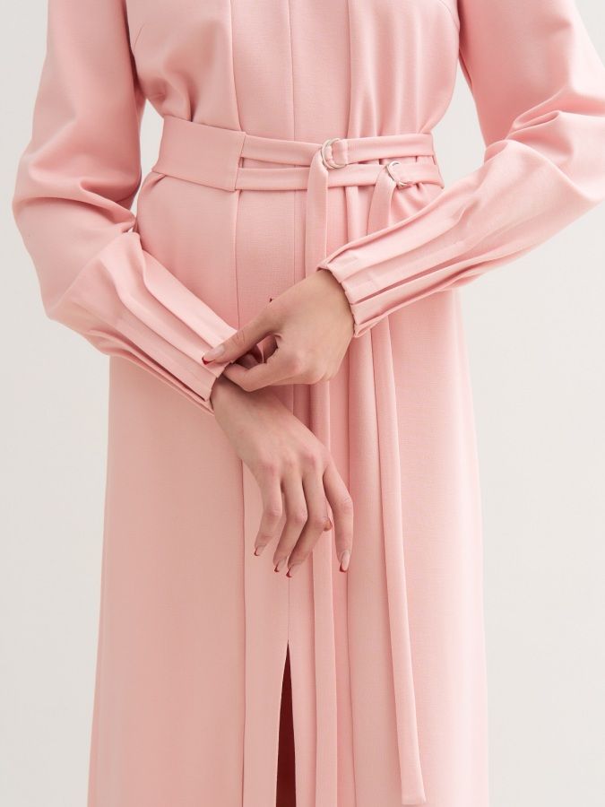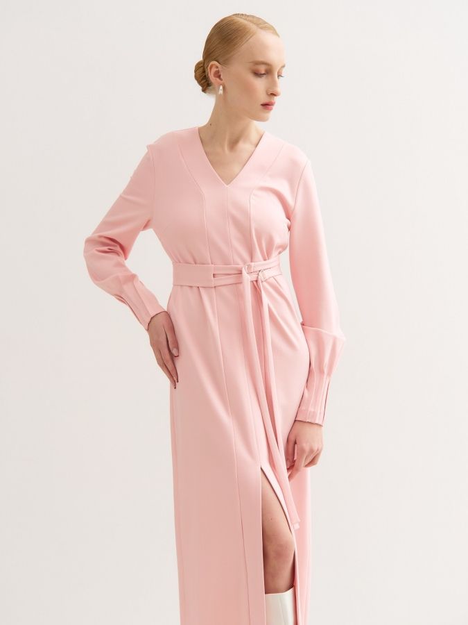 Детали | С длинным рукавом. Низ рукава оформлен длинными защипами «наружу». Горловина V-образная. На полочках пришивная планка с разрезом внизу платья. Дополнительный пояс на двух кольцах.