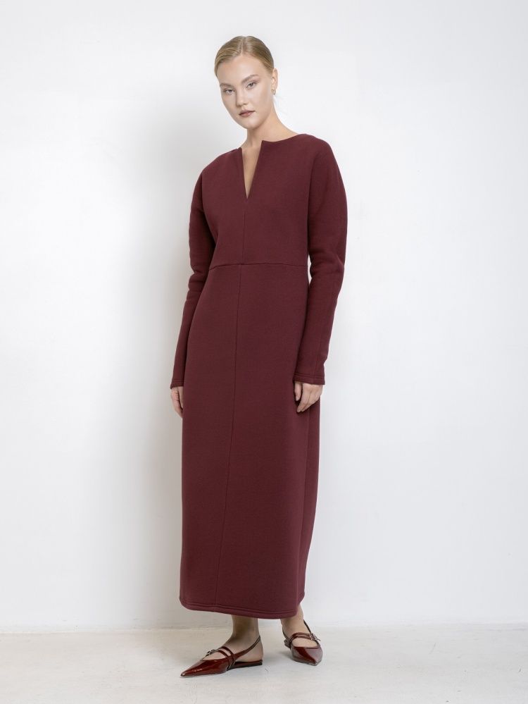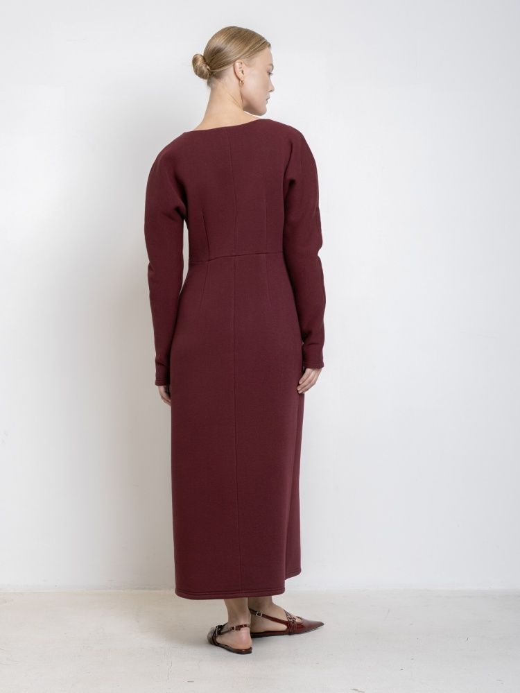 Платье –прилегающего А силуэта. Вырез горловины круглый «лодочка», V-образный вырез спереди, рукав длинный, цельно кроёный, отрезное по линии талии, юбка 4-х клинка «миди», без карманов.