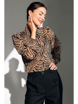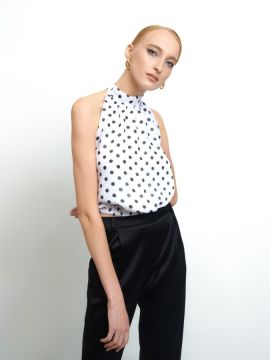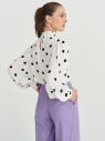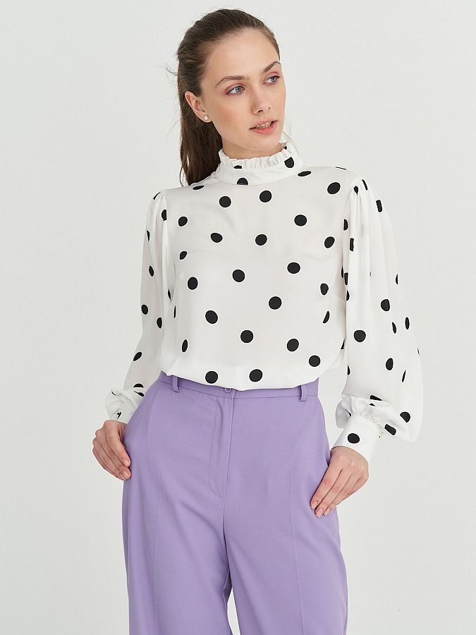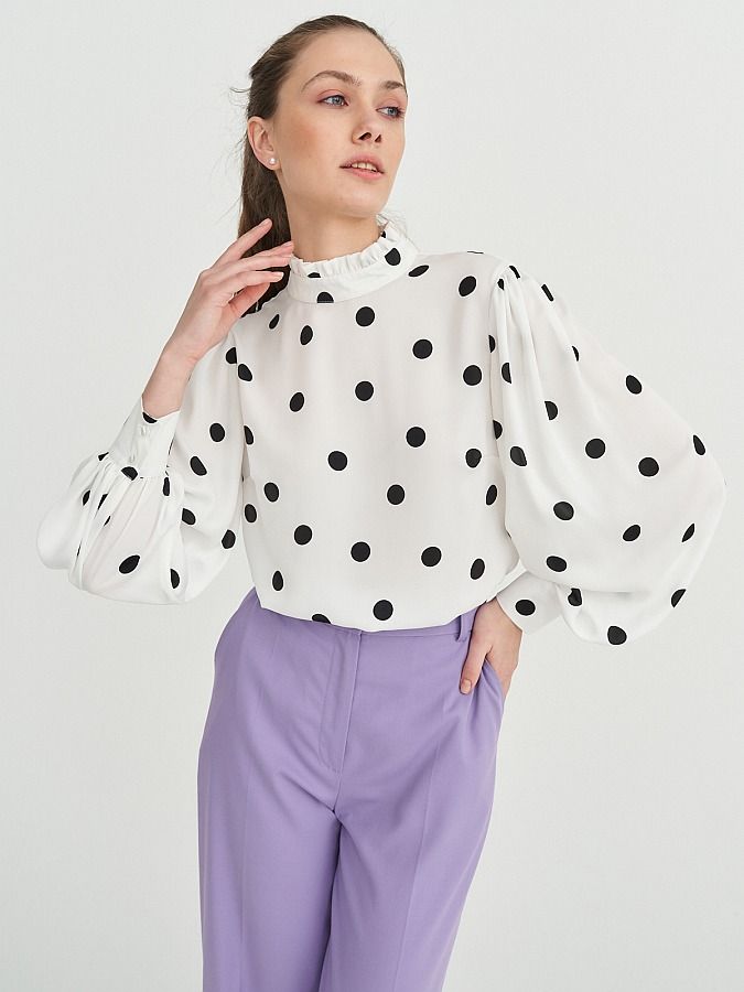 Эффектная блуза в горох с объёмными рукавами и воротником-стойкой, оформленным сборкой.