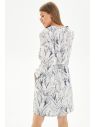 Платье-рубашка в стиле smart casual выполнено из вискозного. Модель приталенного силуэта, со спущенной линией плеча, отрезная по линии талии, с узкой эластичной лентой в шве соединения лифа с юбкой. Спереди предусмотрена застежка на декоративные пуговицы, а в боковых швах карманы. Для придания объема лифу от талии заложены глубокие односторонние складки. Рукава 3/4, на застегивающейся манжете. Воротник отложной на стойке. Нижняя часть платья на подкладке. Длина изделия 96 см. Длина рукава(от горловины) 64 см.