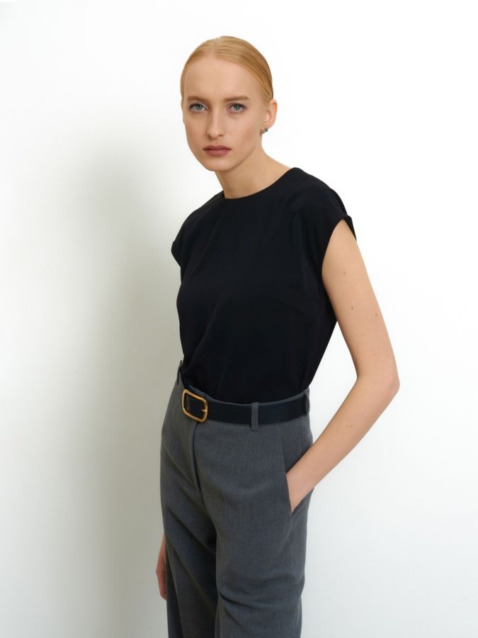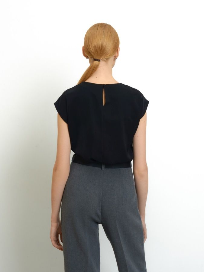 Детали | Спущенное плечо, без рукавов. Круглый вырез горловины на полочке.