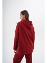 Блуза женская, худи, прямого силуэта, разноуровневая, с открытой шлицей по боковым швам, с капюшоном. Плечо спущенное, рукав втачной, длинный. По горловине спинки и по припуску боковой шлицы спинки настрочена принтованная репсовая лента. На капюшоне установлены люверсы и вставлена в них та же принтованная репсовая лента.