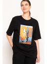 На футболке работа художника Ксении Сенченко "Сентябрь". Блуза женская из тонкого трикотажного полотна с добавлением эластана, прямого силуэта. Горловина круглая, с притачной бейкой. Рукав втачной, короткий. Посередине переда настрочен прямоугольник из принтованного шелка.