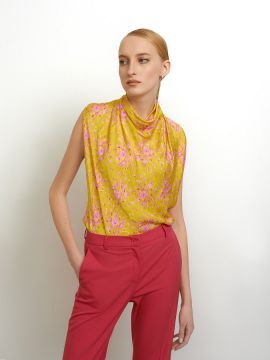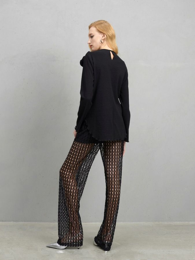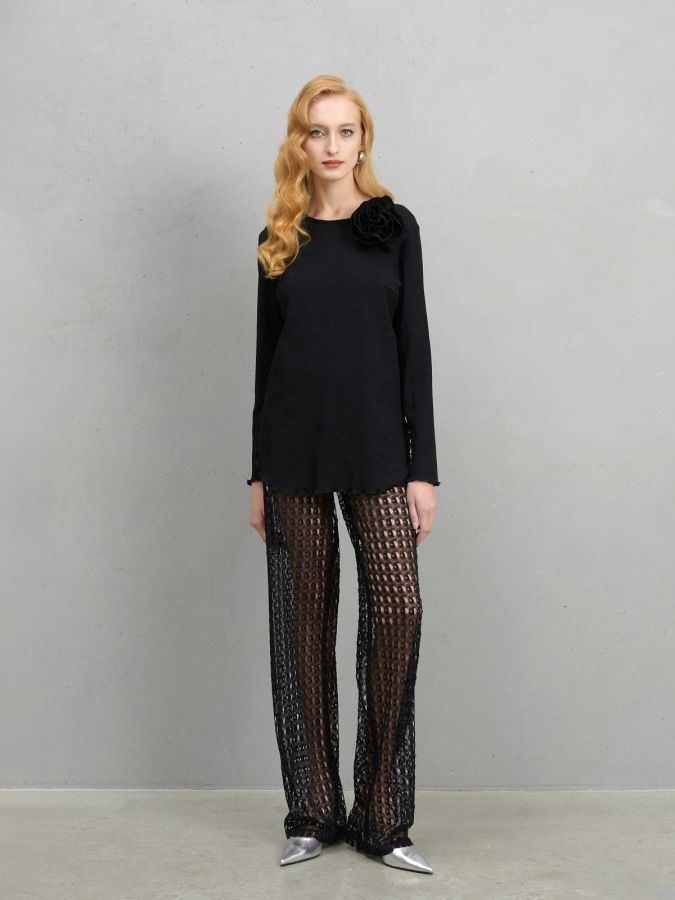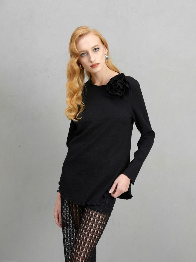 Блуза прямого силуэта с длинным рукавом. Вырез горловины круглый. Застежка в среднем шве спинки на навесную петлю с пуговицей. В боковых швах разрезы длиной 18 см. Углы разрезов скругленные. Низ рукава и блузы обработан «закруткой». Дополнительный декор в виде цветка-броши.