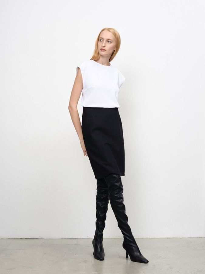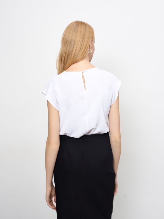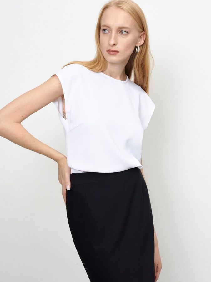 Детали | Спущенное плечо, без рукавов. Круглый вырез горловины на полочке. Застежка сзади на пуговицу с навесной петлей.