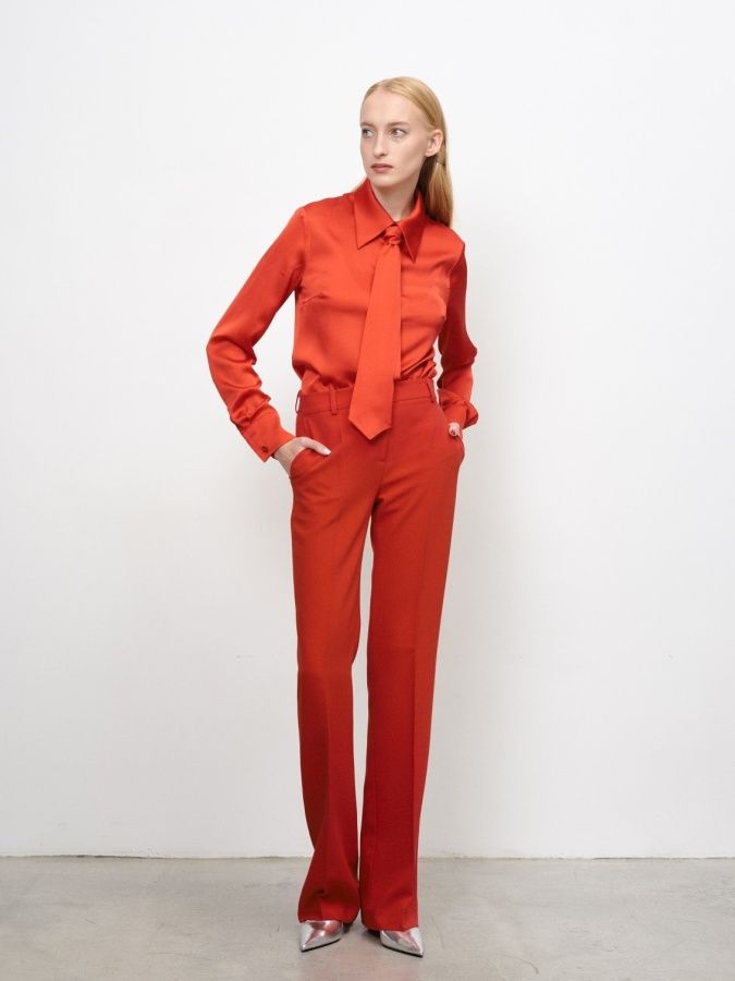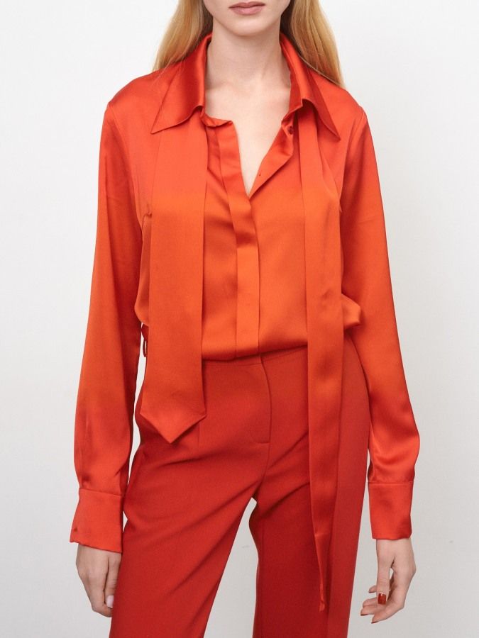 С длинным рукавом на широкой манжете (8см). Застежка центральная «супатная», на пуговицы. На спинке кокетка и две складки. Воротник отложной на стойке. Декоративный завязывающийся галстук.