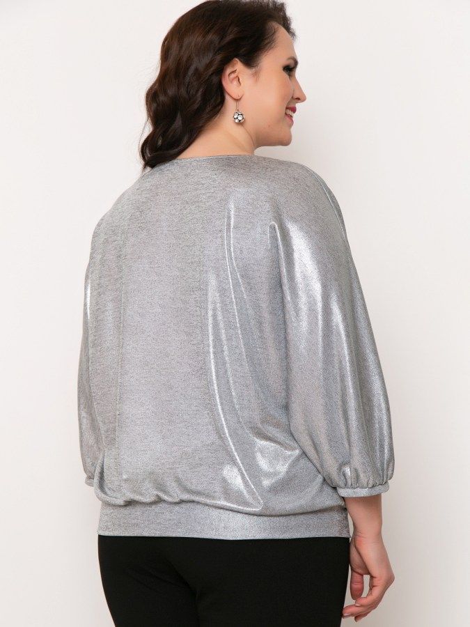 Блуза женская прямого силуэта. Рукав цельнокроенный, 3/4, горловина круглая. Низ блузы и низ рукава собраны в сборку, с притачной манжетой. Горловина переда и спинки окантована бейкой из основного сырья.