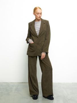 Брюки женские прямого силуэта, расширенные к низу. Перед с центральной застежкой гульфик на тесьму-молнию. Пояс с застежкой на петлю и пуговицу. С 56 размера по поясу задней половинки брюк эластичная тесьма.
