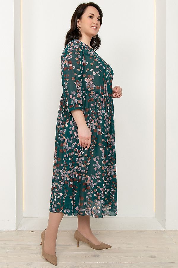 Платье женское А-образного силуэта, отрезное по линии талии, с застежкой на короткую потайную молнию в среднем шве спинки. Горловина круглая, рукав втачной, 3/4, по низу со сборкой и притачной манжетой. Верхняя часть переда с рельефными швами, нижняя часть переда и спинки слегка расклешенная, собрана в сборку по шву притачивания. По талии в шлевки продет пояс с пряжкой. К платью прилагается чехол из тонкого трикотажного полотна.