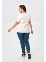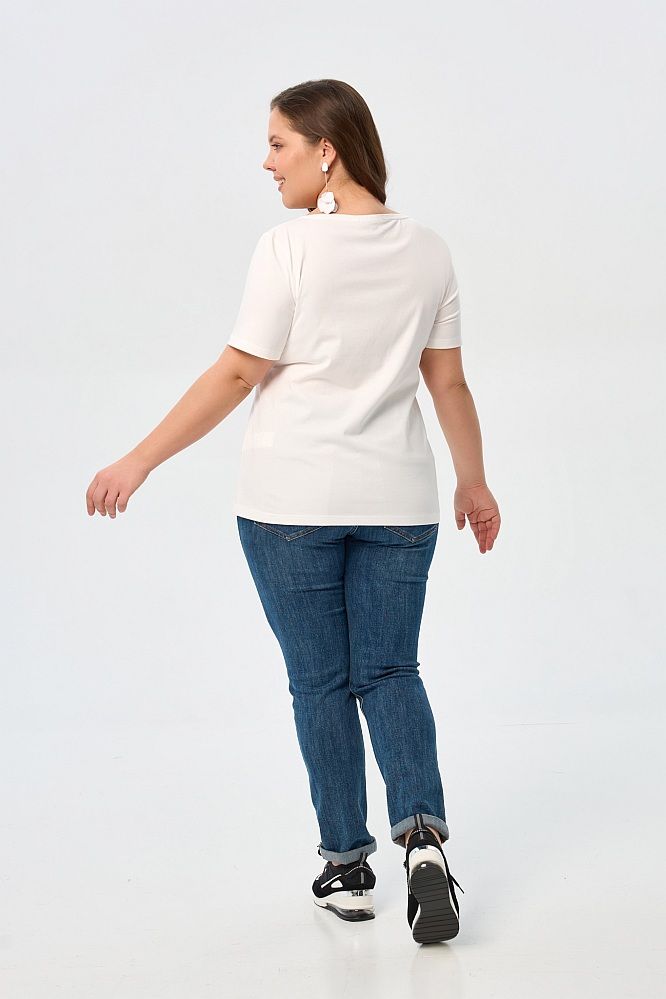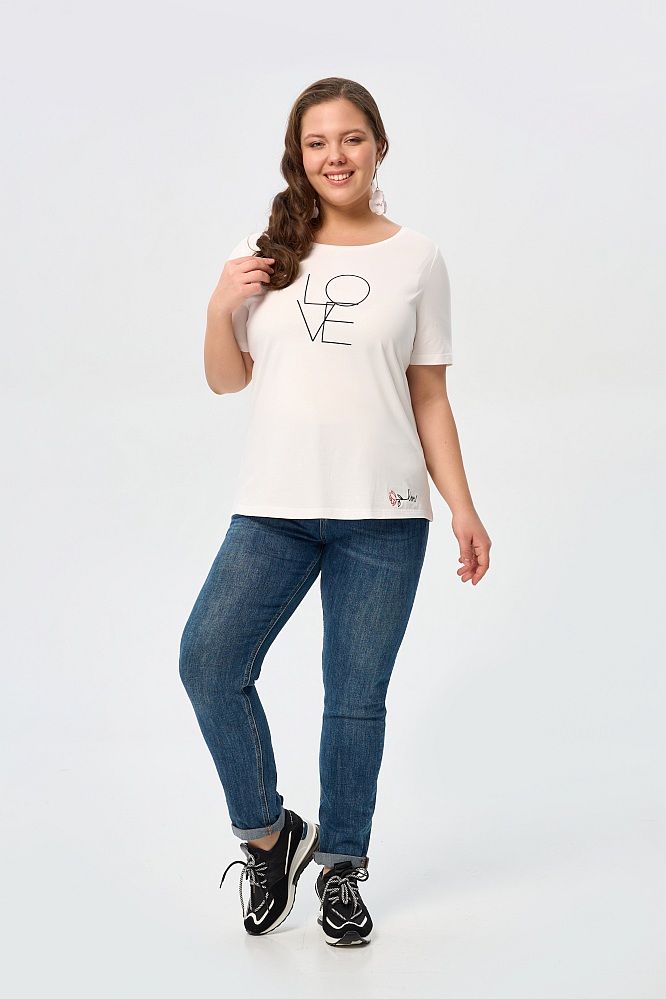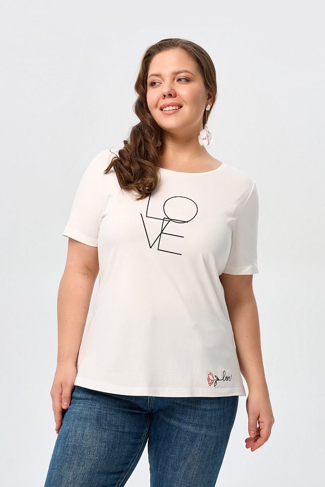 Блуза женская прямого силуэта. Горловина круглая, с притачной бейкой. Рукав втачной, короткий.Посередине переда выполнена печать. Изделие изготовлено из кулирной глади.