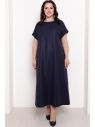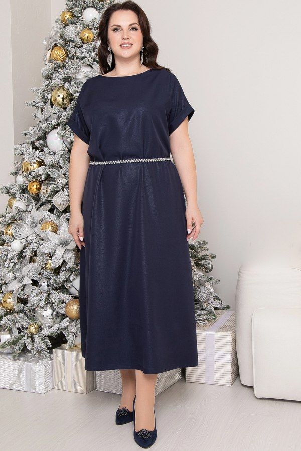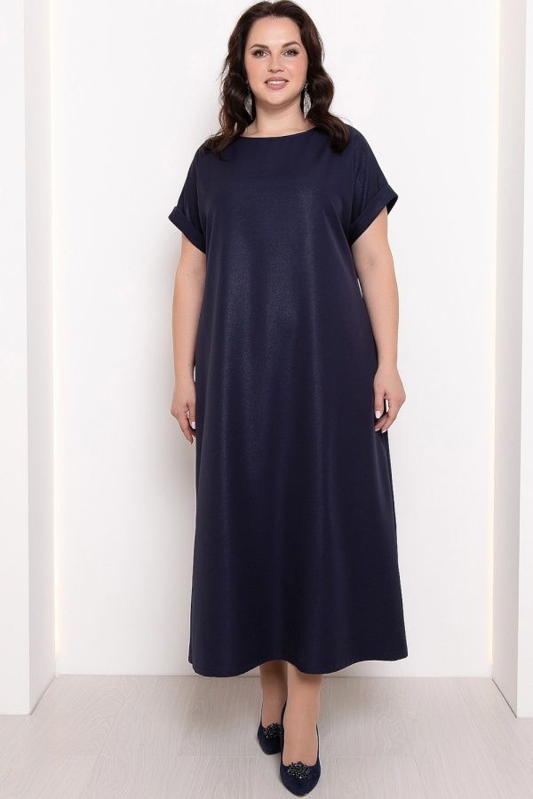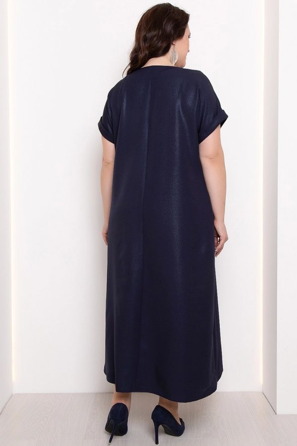 Платье женское А-образного силуэта, из костюмно-плательной ткани с напылением, с карманами в боковом шве.Горловина круглая, рукав цельнокроенный, короткий, на притачной манжете.Основной цвет - темно- синий с напылением.