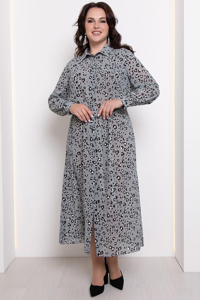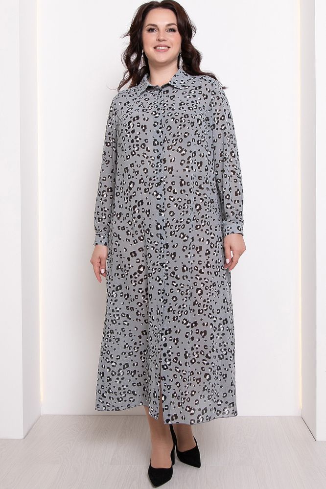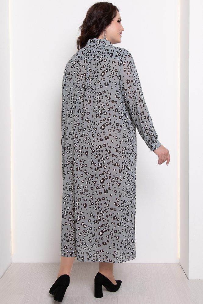 Плаье женское прямого силуэта, с открытыми шлицами в боковыхх швах, с завязывающимся съемным поясом. Перед с центральной застежкой на планку с петлями и пуговицами. Спинка с плечевой кокеткой, со встречной складкой посередине кокетки. Рукав втачной, длинный с манжетой по низу, застегивающейся на петлю и пуговицу. Воротник на стойке. К платью прилагается съемное платье-чехол из тонкого трикотажного полотна.. Ткань верха - шифон. Основной цвет - серый.
