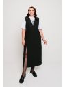 Сарафан женский полуприлегающего силуэта, удлиненный. Горловина V-образная, глубокая, пройма низкая, в левом боковом шве потайная молния. Перед с рельефными швами, с прорезными карманами в листочку. В правом рельефном шве - разрез. Спинка с вытачками и с открытой шлицей в среднем шве. Средний шов и обтачка горловины спинки окантованы атласной бейкой черного цвета. На обтачке горловины спинки выполнена печать DTF. Изделие изготовлено из костюмной ткани.