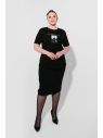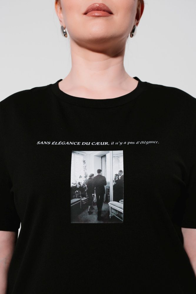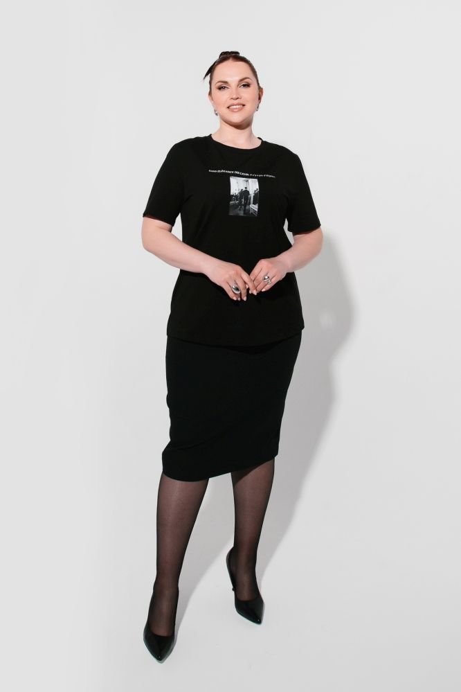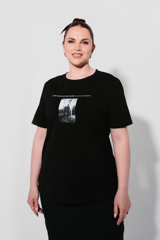 Блуза женская прямого силуэта. Горловина круглая, с притачной бейкой. Рукав втачной, короткий. По середине переда с лицевой стороны и по спинке с изнаночной стороны выполнена печать DTF. Изделие изготовлено из кулирной глади.