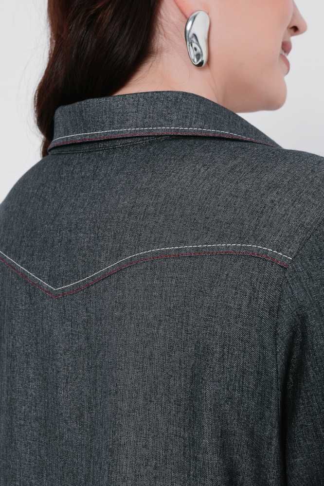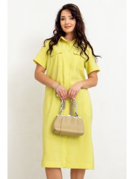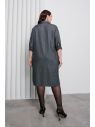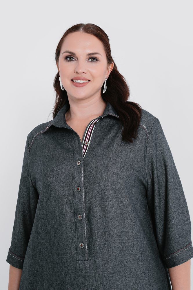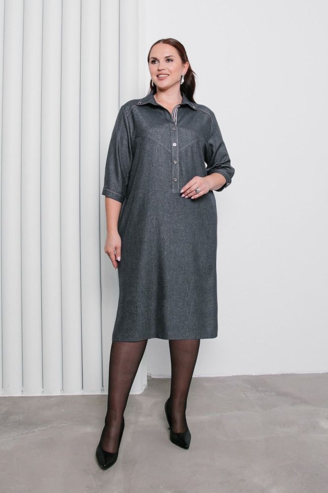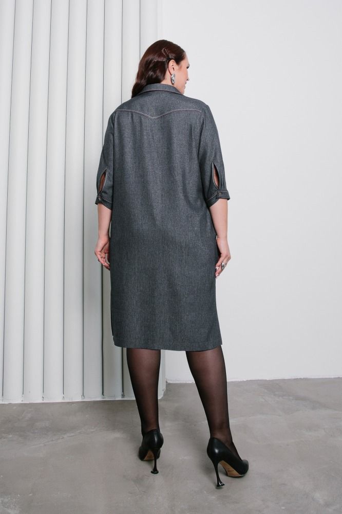 Платье женское прямого силуэта с карманами и разрезами в боковом шве. По переду кокетка и притачная планка, застегивающаяся на петли и пуговицы.Спинка с фигурной кокеткой. Воротник на стойке. Рукав -3/4 с притачной манжетой, застегивающейся на пуговиц.На левую планку переда настрочена отделочная тесьма. Воротник, кокетки, манжета настрочены двойной строчкой отделочными нитками.