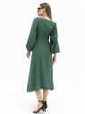 Отрезное по линии талии. Верхняя часть с отрезным лифом, подрез фигурный. По верхнему краю лифа кулиска, в которую вставлены бретели-завязки, формирующие драпировку. Вырез горловины глубокий, расширенный, по форме напоминающий каре, с вырезом до линии подреза. Прилегание платья создано за счет рельефов на деталях переда и вытачек на деталях верхней и нижней части спинки. В верхней части среднего шва спинки застежка на потайную молнию. Рукава втачные, длинные, со сборкой по окату и низу рукава. В подгибку низа рукава вставлена резинка.
