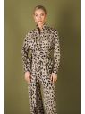 Костюм выполнен из эластичного полотна с жаккардовым анималистичным узором. Брюки прямого силуэта. Пояс притачной с эластичной резиной. На передней части брюк застрочены стрелки. Жакет прямого свободного кроя с женственным шалевым воротником и накладными карманами. Втачной длинный рукав. В комплекте пояс из основной ткани, позволяющий создавать приталенный силуэт.