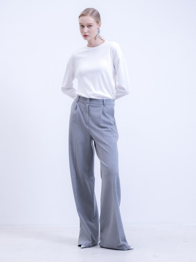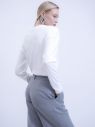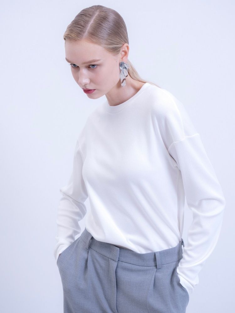 Белый лонгслив в рубчик прямого силуэта. С длинным рукавом. Плечо спущенное. Горловина круглая.