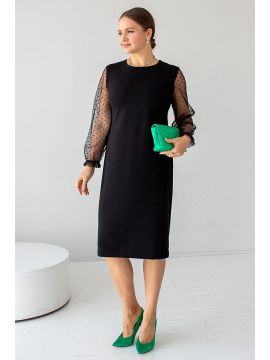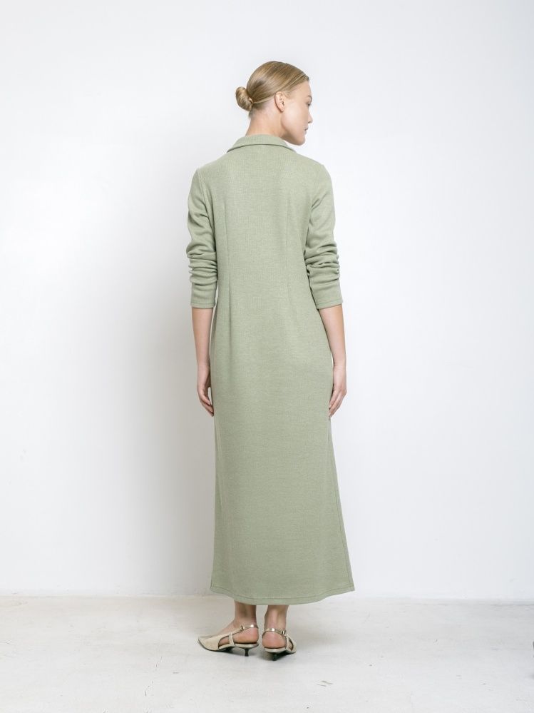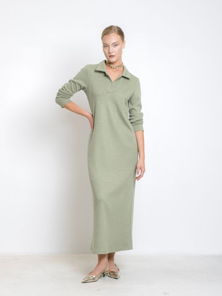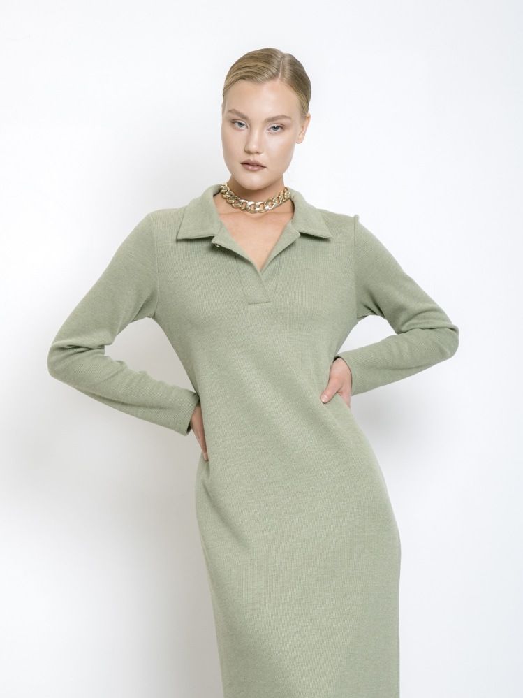 Платье прямое, полуприлегающего силуэта, горловина поло с отложным воротником с застежкой на одну навесную петлю и пуговицу. Рукав длинный. Полочка прямая, спинка с двумя талевыми вытачками, без карманов