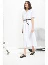 Платье в стиле city chic выполнено из летнего полотна в прозрачную полоску. Модель А-образного силуэта с застежкой на петли и декоративные пуговицы. Плечевой пояс оформлен округлой кокеткой со спущенной линией плеча. Короткие объемные рукава на притачной манжете. Платье комплектуется комбинацией и ремнем с пряжкой. Длина изделия 128 см.