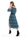Женственное платье в романтическом стиле выполнено из полупрозрачного креш-шифона с оригинальным дизайнерским принтом. Модель приталенного силуэта; отрезное по линии талии , на притачном поясе в спинке которого эластичная тесьма, с застёжкой на тесьму " молнию" в боковом шве. Плечевой пояс оформлен эластичной лентой, что даёт возможность изменять форму горловины. Рукав реглан, низ обработан эластичной лентой, что позволяет откорректировать длину рукава. По переду юбки высокий разрез. Платье на подкладке из вискозного полотна. Комплектуется ремнём с пряжкой. Длина изделия 110 см.; длина рукава 45 см.