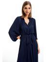 Женственное платье в стиле city chic выполнено из струящегося полотна с эффектом "мокрого шёлка". Модель А-образного силуэта. Горловина-стойка собрана эластичной ниткой "венгеркой". Перед с цельнокраёной фиксированной планкой. Платье отрезное по линии талии, на широкий притачной пояс с эластичной ниткой "венгеркой" и втачной отлетной пояс из основной ткани по переду. Особым декоративным элементом служат объёмные рукава с фигурным низом и эластичной лентой для регулировки длины в нём. Комплектуется подъюбником из натурального полотна. Длина изделия 130см.; длина рукава 45см.