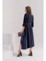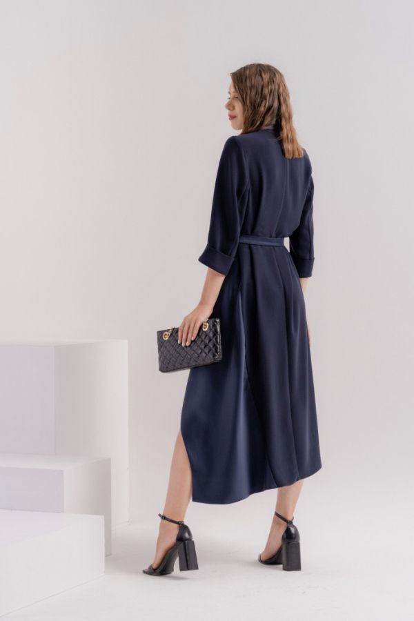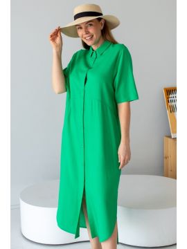 Платье женское свободного покроя, выполнено из двух видов ткани. Вырез горловины оформлен воротником пиджачного типа, застежка на петли и пуговицы. Рукав втачной, по низу с манжетой.
