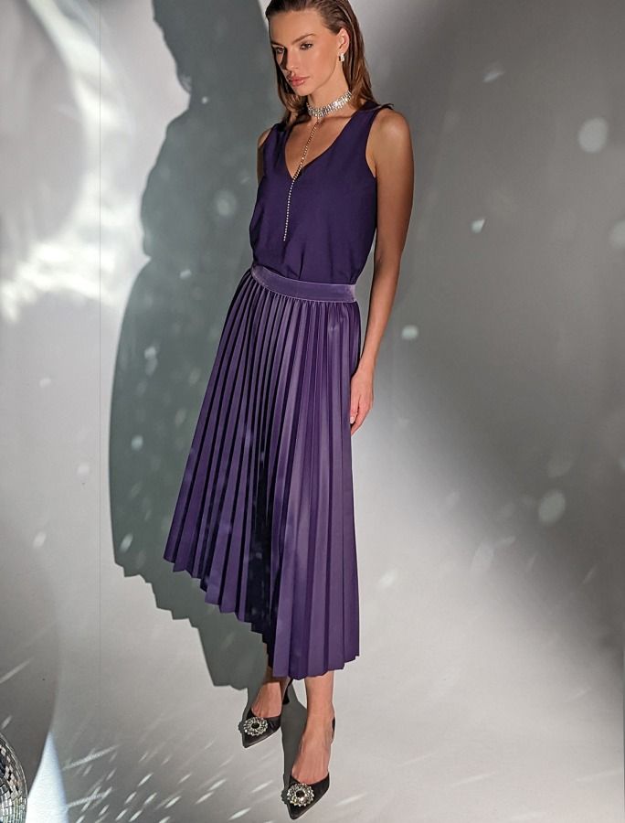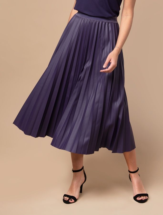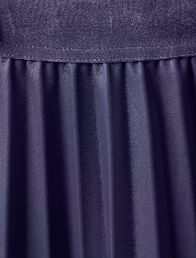 Плиссированная юбка-миди из эко-кожи с эластичным бархатным поясом. Атласное внутреннее покрытие обеспечивает идеальный комфорт при носке с коглготками. Стильное решение для любого повода: с кедами - для осенней прогулки, с изящным каблуком – для яркого торжества. Универсальный фасон подходит для любого типа фигуры. Выполнена из премиальной эко-кожи в оттенке магический аметист.