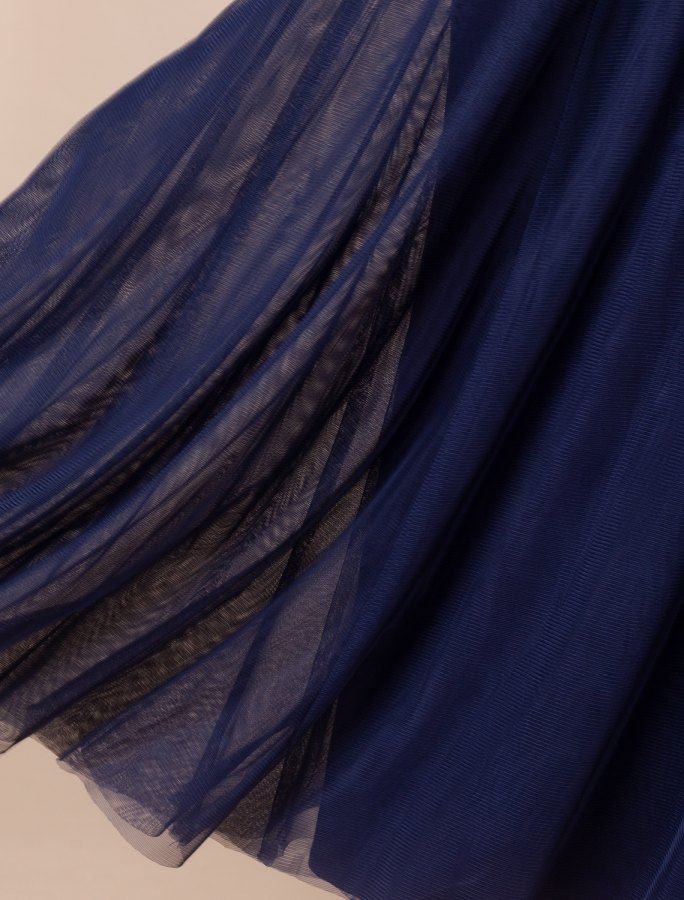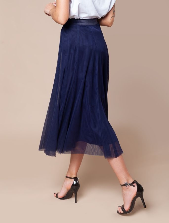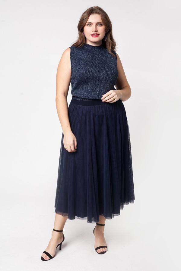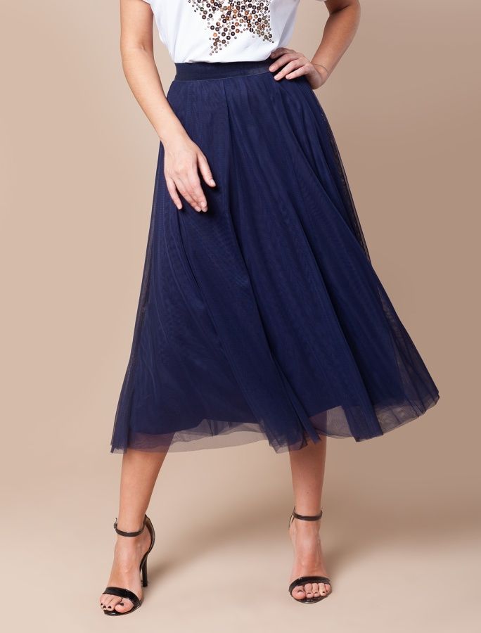 Воздушная юбка в глубоком синем оттенке с бархатным эластичным поясом. Выполнена из мягкого сетчатого материала с подкладкой из вискозы. Совет стилиста: для романтических, женственных образов носите с босоножками на тонком ремешке. Для самых нетривиальных и эффектных - с ботинками или лоферами с носком.