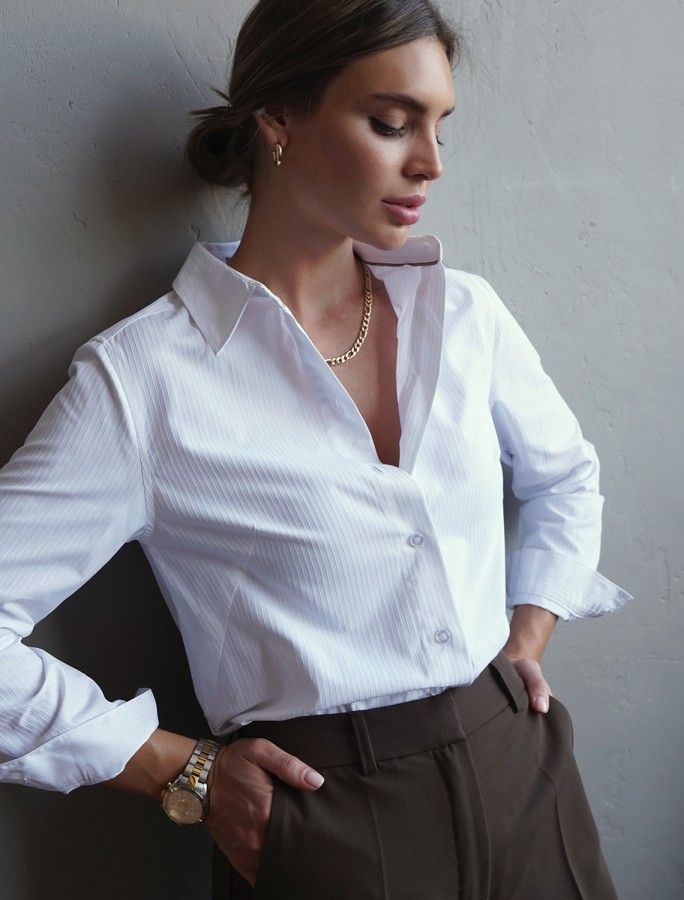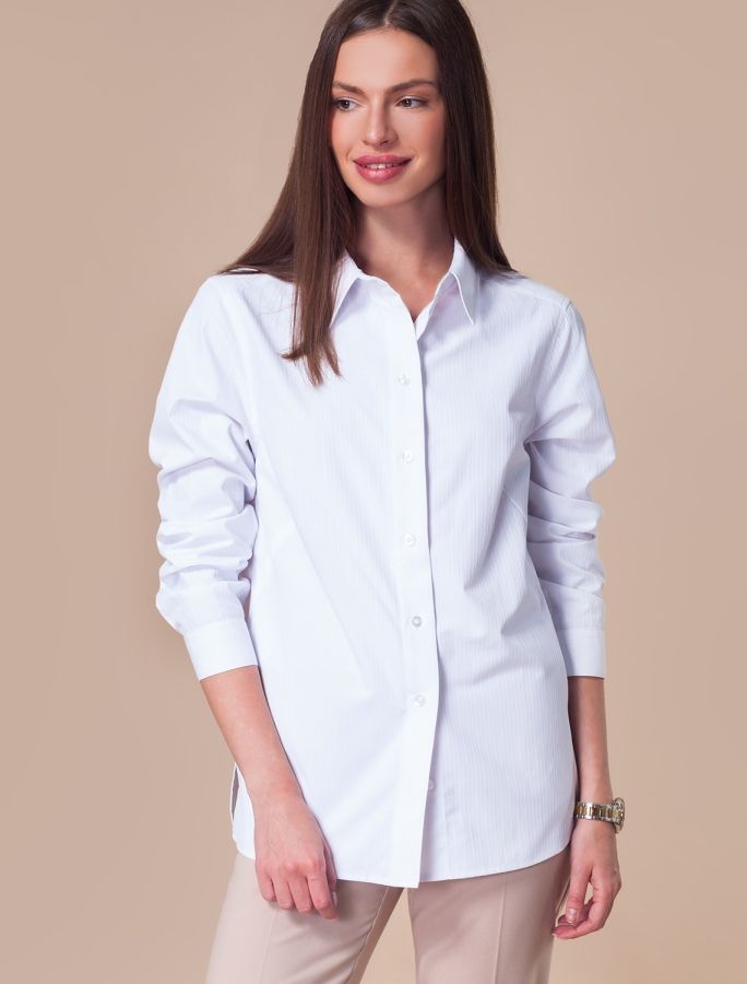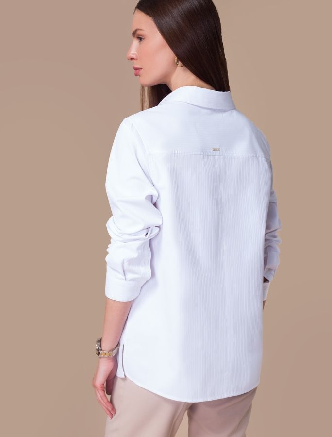 Элегантная блузка полуприлигающего силуэта с фактурным плетение полосы. Выполнена из хлопка высокого качества с добавлением полиэстера. Добавление ПЭ помогает сохранить формоустойчивость,обеспечивает меньшую сминаемость и отличный вид ткани даже после множества стирок. На спинке изделия расположена металлическая нашившка - логотип бренда. Блузка создаст не только идеальный офисный лук, но и расслабленный образ в стиле smart-casual.