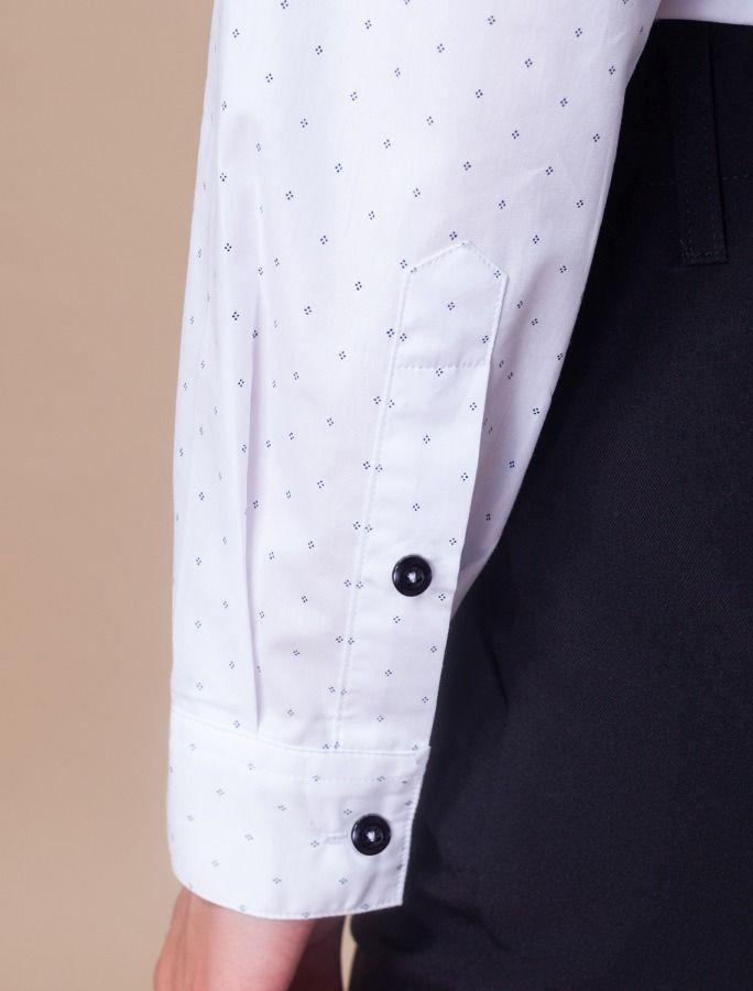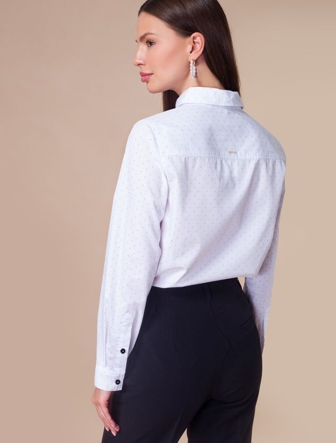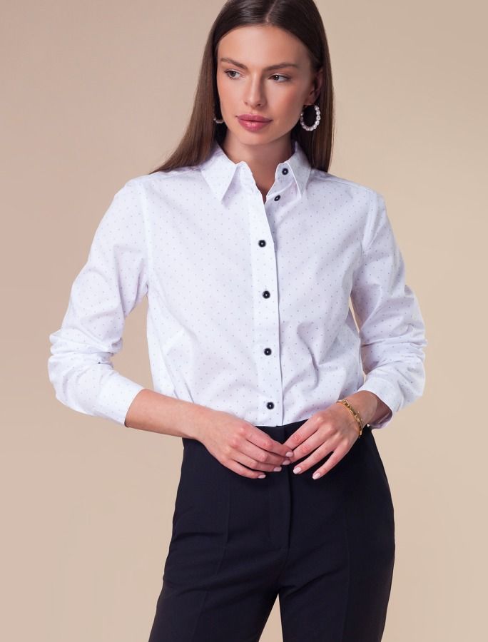 Элегантная блузка полуприлигающего силуэта с принтом. Выполнена из плотного хлопка высокого качества с добавлением полиэстера. Добавление ПЭ помогает сохранить формоустойчивость,обеспечивает меньшую сминаемость и отличный вид ткани даже после множества стирок. Изюминкой изделия служат акцентные пуговицы контрастного цвета. На спинке изделия расположена металлическая нашившка - логотип бренда. Блузка создаст не только идеальный офисный лук, но и расслабленный образ в стиле smart-casual.