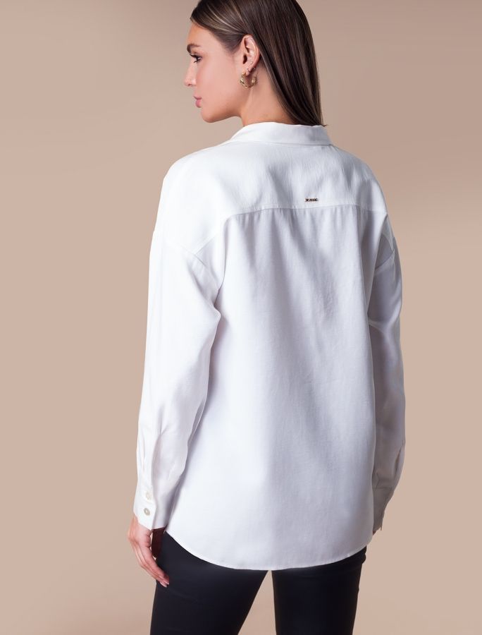 Блузка выполнена из плотной струящейся вискозы полотняного плетения с небольшим эффектом жатки, что делает ткань менее мнущейся и формоустойчивой. V-образная линия борта. Планка с застежкой на пуговицы из натурального перламутра. На спинке изделия расположена металлическая нашившка - логотип бренда. Свободная, летящая блузка - отлично подходит как для деловых образов, так и в качестве накидки в многослойных луках