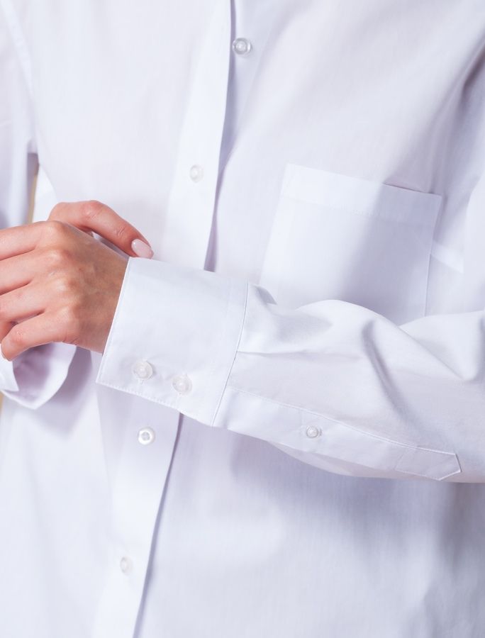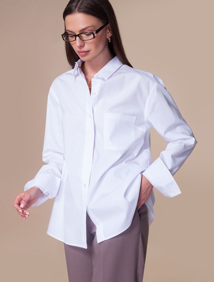 Блузка over-size из гладкого поплина, из хлопка с доавлением ПЭ для комфрта в уходе и формоустойчивости. Сзади складка от кокетки, которая добавляет большей свободы движениям. Спущенное плечо и умеренный over-size стильно сочетается с поясом или топом, водолазкой, в расстегнуом виде, а также самостоятельно, с узким низом навыпуск или широким в заправку. Отлично впишется как в офисный так и повседневный стиль.