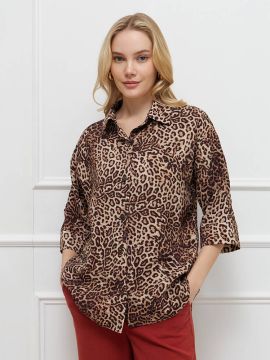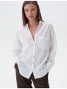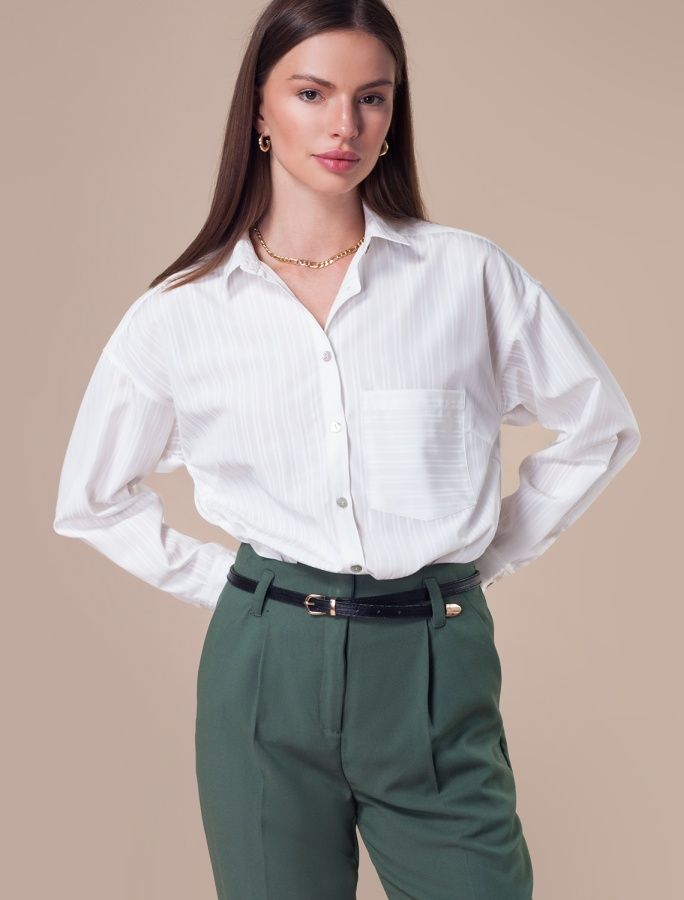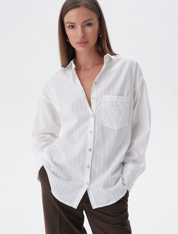 Свободная блузка из летящей хлопковой ткани. Нежный принт в полупрозрачную полоску визульно вытягивает силуэт. Добавление ПЭ в состав ткани гарантирует формоустойчивость и меньшую сминаемость ткани. Спущенное плечо и over-size стильно сочетается с поясом или топом, водолазкой, в расстегнуом виде, а также самостоятельно, с узким низом навыпуск или широким в заправку. Модель украшена пуговицами из натурального перламутра. На спинке изделия расположена металлическая нашившка - логотип бренда.