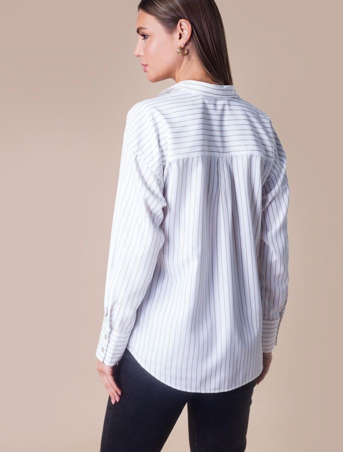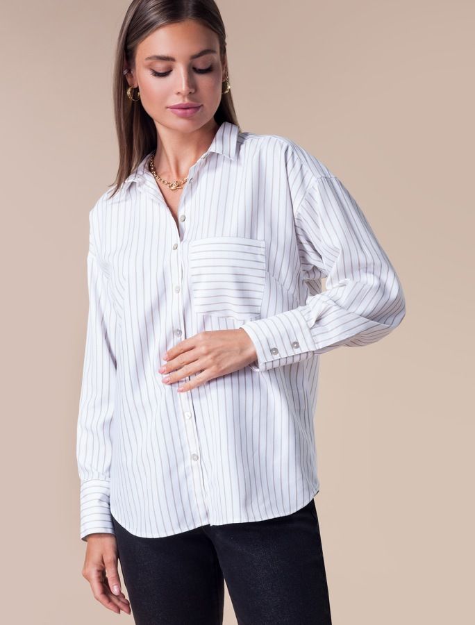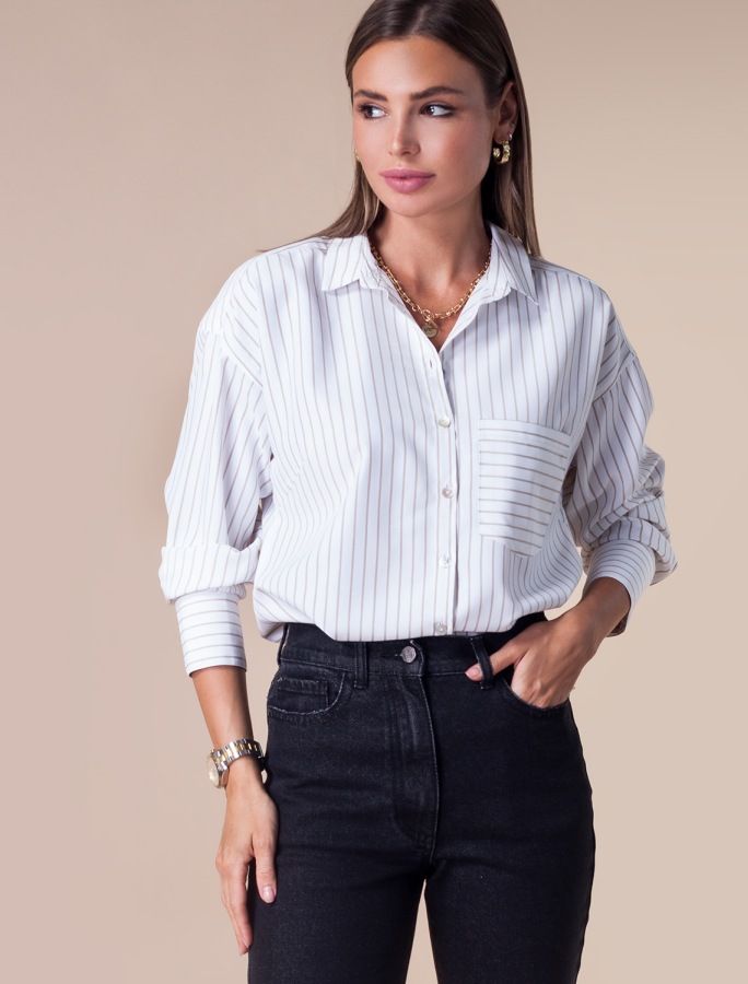 Свободная блузка из летящей хлопковой ткани. Нежный принт в полоску визульно вытягивает силуэт. Добавление ПЭ в состав ткани гарантирует формоустойчивость и меньшую сминаемость ткани. Спущенное плечо и over-size стильно сочетается с поясом или топом, водолазкой, в расстегнуом виде, а также самостоятельно, с узким низом навыпуск или широким в заправку. Модель украшена пуговицами из натурального перламутра. На спинке изделия расположена металлическая нашившка - логотип бренда.