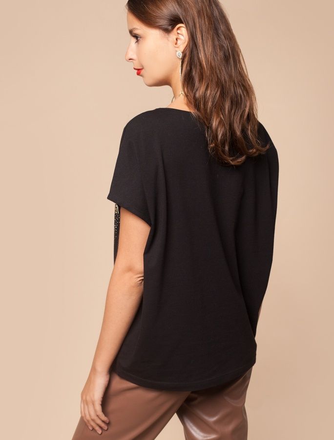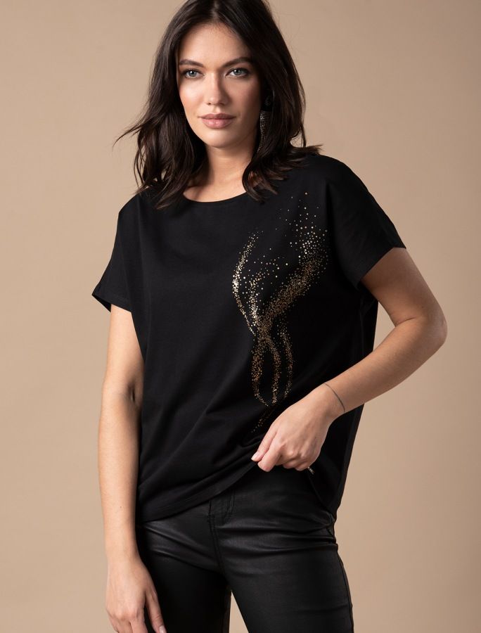 Футболка с цельнокроеным рукавом из премиального хлопка. Устойчивый принт выполнен фольгой и золотым пуффом. Отлично подойдет как для торжественных встреч, так и для повседневного образа в стиле glam chic. Самое высокое качество хлопковых волокон с добавлением эластана. Идеально держит форму и сохраняет внешний вид в течение договременного использования.