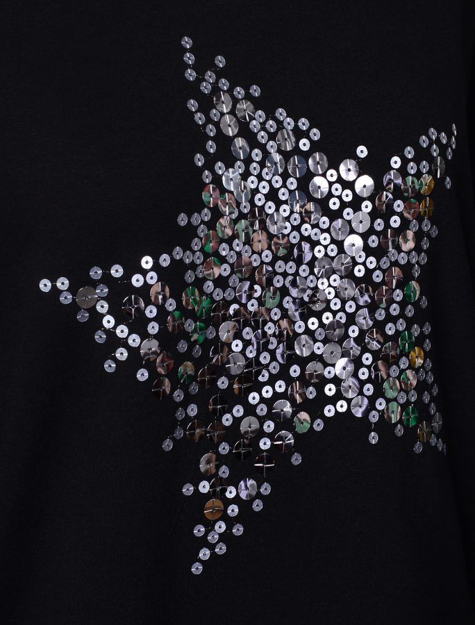 Футболка с цельнокроеным рукавом из премиального хлопка. Лаконичный принт вышит мерцающими пайетками. Отлично подойдет как для торжественных встреч, так и для повседневного образа в стиле glam chic. Самое высокое качество хлопковых волокон с добавлением эластана. Идеально держит форму и сохраняет внешний вид в течение договременного использования.